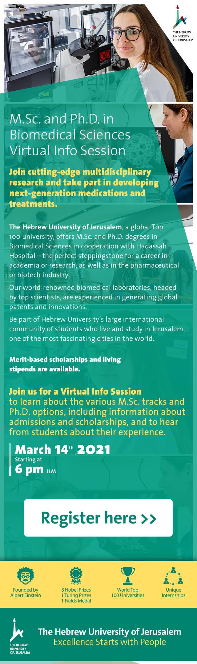 Придружите се врхунским истраживачким програмима у области биомедицине на Хебрејском универзитету у Јерусалему, једном од 100 најбољих свјетских универзитета. Програм се одвија у сарадњи са болницом Хадасса у Јерусалему. Савршен почетак академске истраживачке каријере, или каријере у pharma i biotech индустријама.