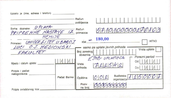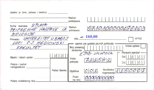 НАПОМЕНА: Уплатнице доставити предавачу на увид на првом часу припремне наставе, а тачан термин и мјесто одржања наставе биће оглашено на Web страници факултета!